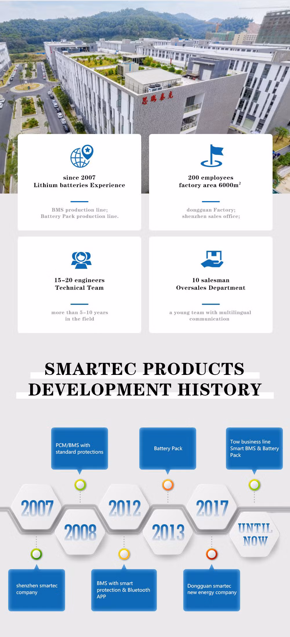 Smartec ha participado en el campo de la nueva energía durante más de 17 años, que cubre la I+D, ventas y fabricación de circuitos de protección de batería de litio (PCM), sistema de gestión de batería (BMS), baterías de ion-litio/NMC/ LiFePO4, el sistema de almacenamiento de energía todo en uno (ESS), cargadores de batería de litio, etc.