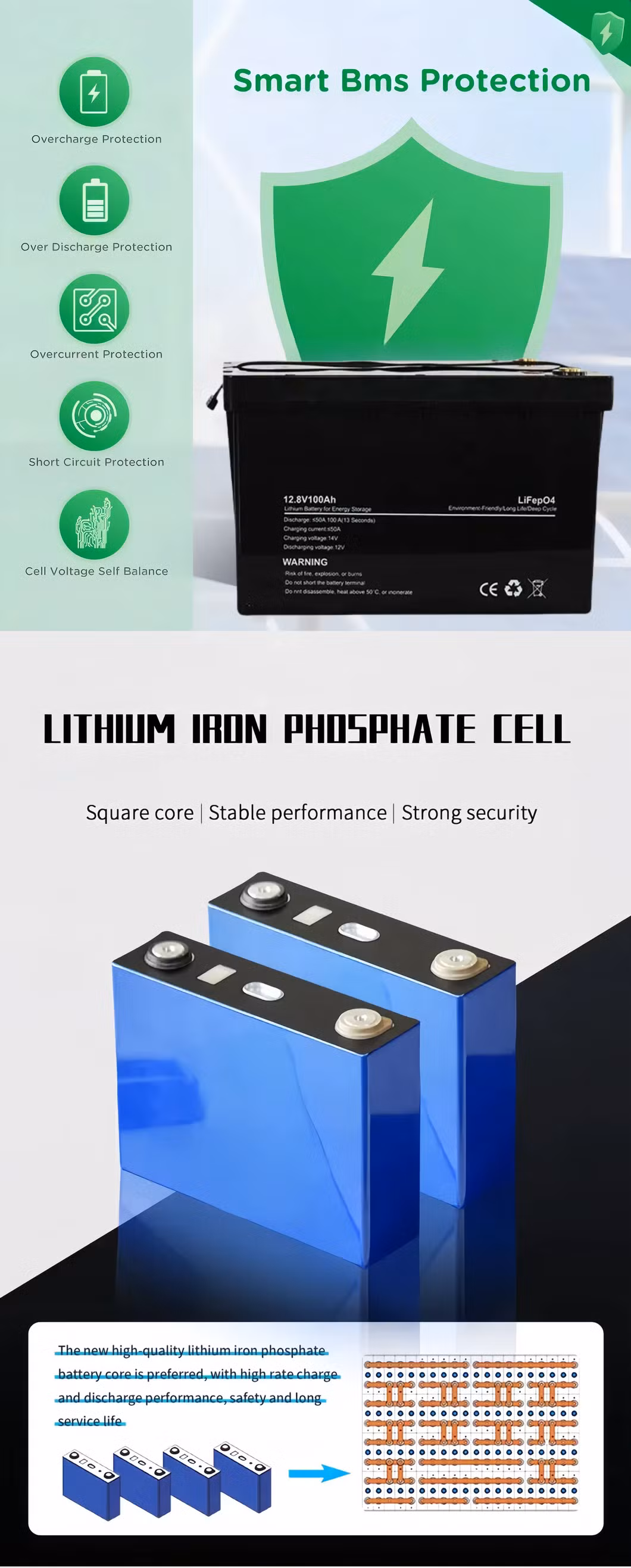 - El material de cátodo está fabricado en LiFePO4 con un rendimiento de seguridad y una larga vida útil.